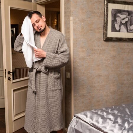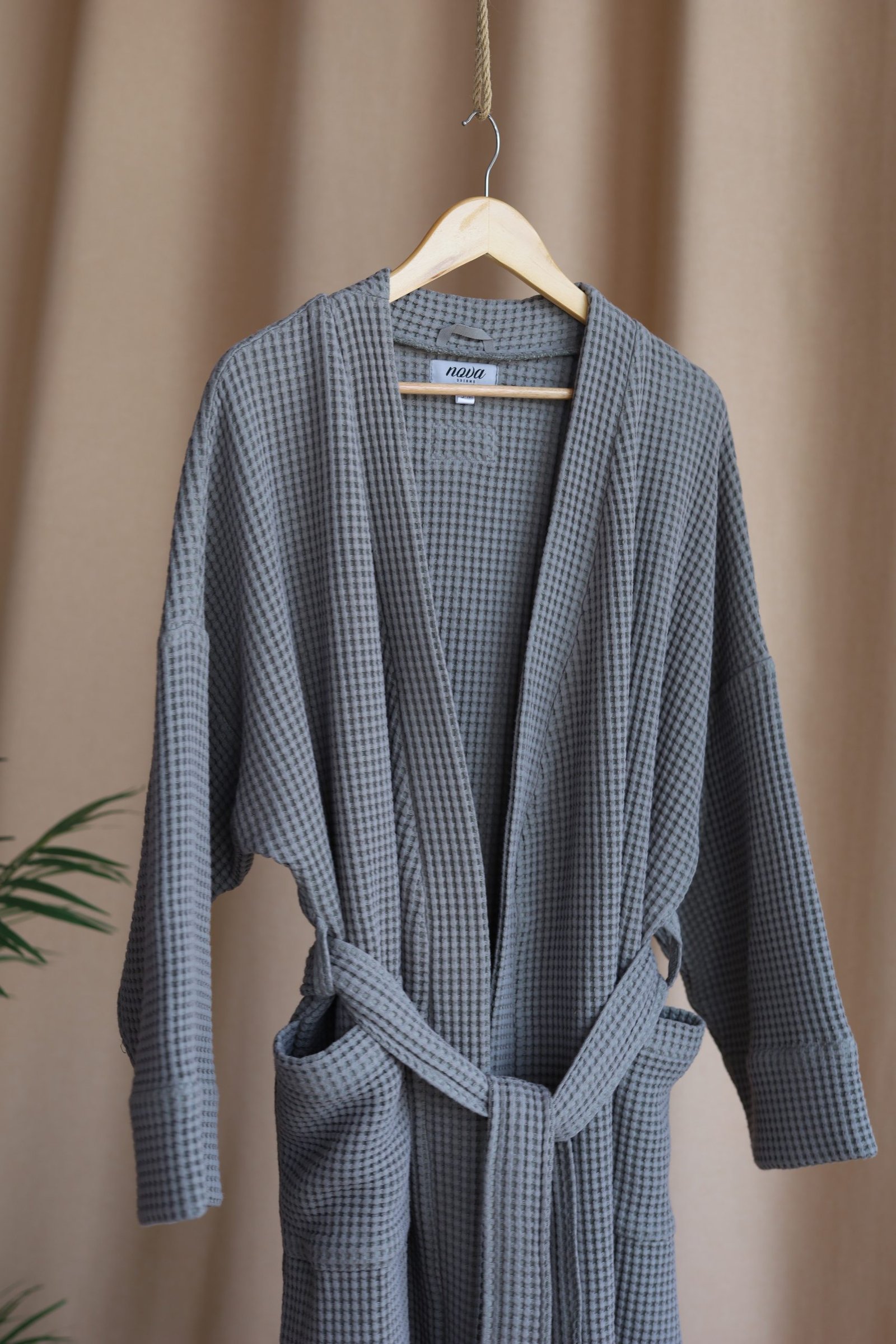 Step into a world of comfort and elegance with our anklelength Wafe Bathrobe, designed to offer a perfect blend of style, functionality and luxurious comfort. Crafted from premium Italian cotton with a distinctive wafe weave, this bathrobe is an ideal choice for spa days, after-bath relaxation, or leisurely mornings at home. It is breathable and quite lightweight. This bathrobe features a classic design with a shawl collar, two spacious front pockets and a self-tie belt for easy adjustment, ensuring a secure and personalized fit.